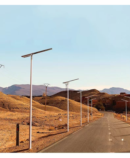 This high-performance solar street light is designed with a durable die-cast aluminum and PC housing, paired with a glass-laminated monocrystalline silicon solar panel for maximum energy efficiency. Available in 20W, 40W, 60W, and 100W versions, it features 20 to 160 high-brightness LEDs and emits cool white light.